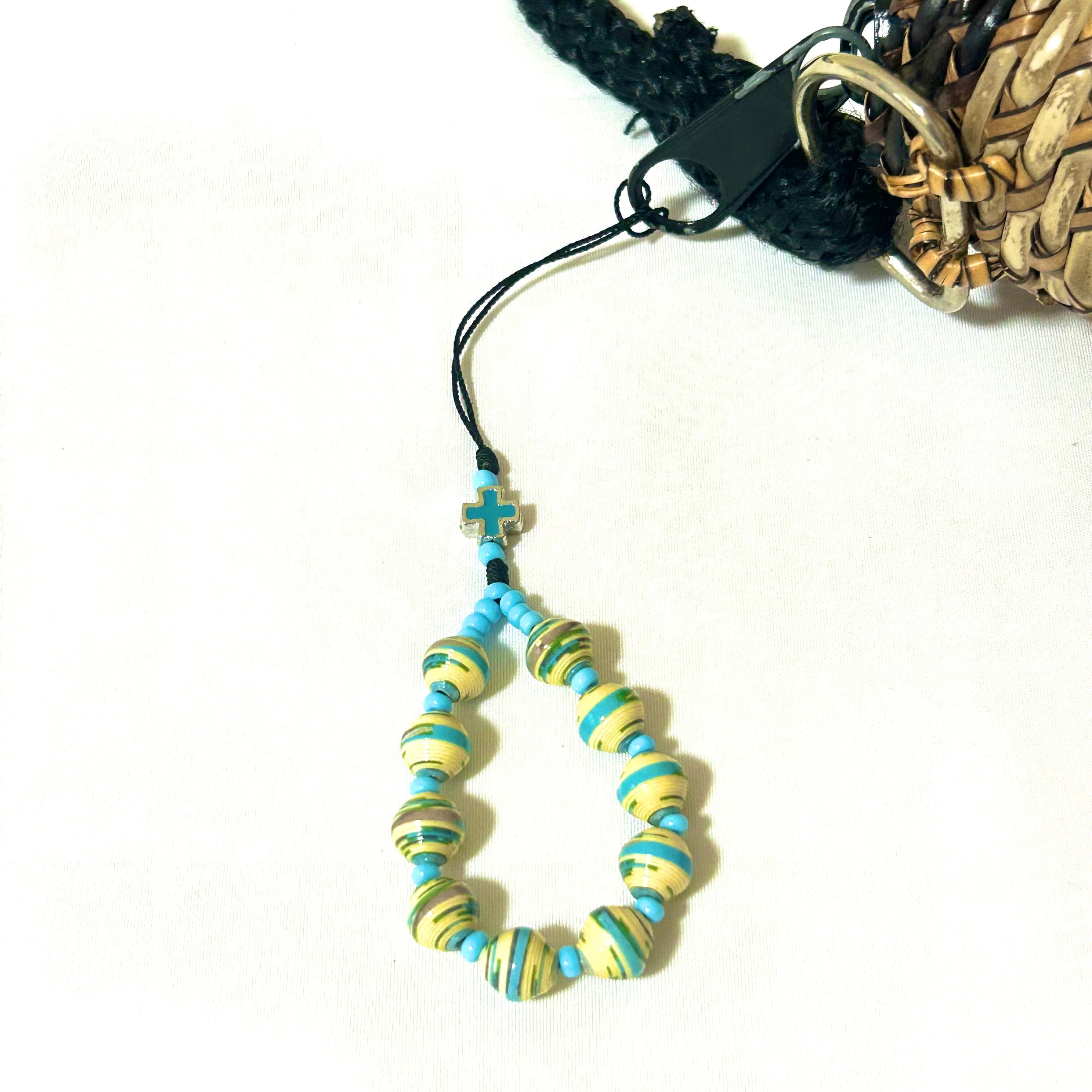 ライトブルーのビーズとマーブルグリーンのペーパービーズで組み合わせたストラップ。